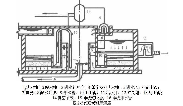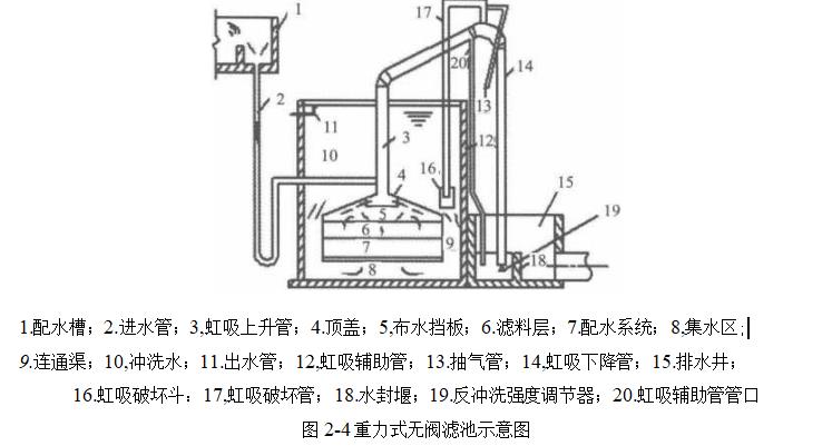 虹吸濾池的濾料組成和濾速選定與普通快濾池相同,采用小阻力配水系統.所不同的是利用虹吸原理進水和排走反洗水.