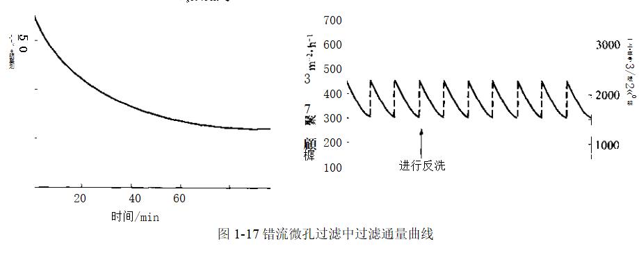 采用定期原位反沖洗對膜的清洗是有效果的.這種沖洗方式可以產生“鋸齒”形通量變化曲線(圖1-17),最終也會逐漸衰減為低通量