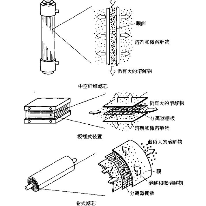 不同種類的膜組件:平板、管狀和毛細管.后來發展起來的有中空纖維形式膜組件.