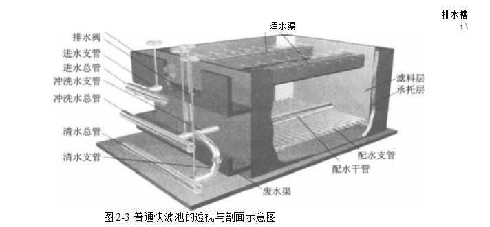快濾池一般用鋼筋混凝土建造,它內有排水槽,濾料層,墊料層和配水系統; 外有集中管廊,配有進水管,出水管,沖洗水管,沖洗水排出管等管道及附件.