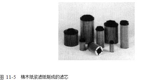 棉木紙漿濾紙纖維結構與今天的化纖、玻纖及金屬纖維比較,它的纖維粗,不均且呈扁狀。其外表的粗糙不規則成為它吸附顆粒的優勢,但纖維不細卻降低了它的吸附能力。因為纖維粗細才是過濾效果的關鍵。從植物纖維濾紙的顯微圖片(圖11-4)可見到其縱斷面纖維排列屬于由疏到密搭配,以達到迎油面纖維間隙大,更能儲灰的目的。棉木漿濾紙制成的濾芯見圖11-5。